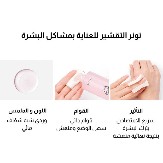 تونر تقشير ناسيفيك يقشر خلايا الجلد الميتة ويرطب البشرة بعمق و يمنحك بشرة نظيفة و مشرقة . تونر ناسيفيك يرطب البشرة بعمق ليعمل على تفتيح البشرة و تقليل التجاعيد كما يحسن مرونة البشرة وإشراقها .- تونر ناسيفيك بينك يرطب البشرة بعمق.